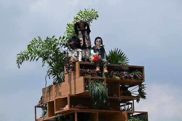 Atop the visual metaphor sits three sculptures of children, designed by local artist Raizha Guzmán, who each hold a different item to symbolize paying attention, speaking up and caring for nature – actions Mr. Von Wong said he hopes the art will inspire. Beside the tower, sit a handful of blocks that appear to have been removed from the tower and represent contributors to biodiversity loss, such as plastic pollution, deforestation or monocultures.