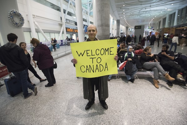 Andrew Harris of Toronto holds a sign welcoming Syrian Refugees at the international arrivals section of Pearson International Airport in Toronto on Dec. 10, 2015.J.P. MOCZULSKI/The Globe and Mail