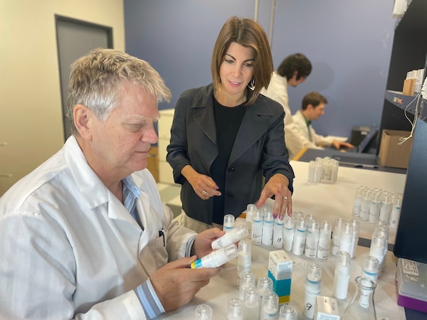 SaNOtize chief scientist Chris Miller and chief executive officer Gilly Regev with the Vancouver-based pharmaceutical company's nitric oxide nasal spray. The spray was approved this week by India's drug regulator for use as a treatment for mild COVID-19.Supplied
