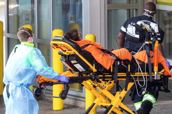A patient is taken into the emergency department at Toronto's Michael Garron Hospital by paramedics wearing protective personal equipment, Sunday, March 29, 2020. As of Sunday, there were more than 6,250 identified cases of COVID-19 in Canada and 63 deaths.Chris Young/The Canadian Press