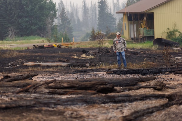 Lance Lauze, the owner of the Tatuk Lake Lodge outside Vanderhoof, B.C., leaves his shed with a sprinkler system set up to protect it from a wildfire burning nearby. Lauze says if it weren’t for the sprinkler system and the firefighters who set it up (and then got trapped by the blaze and helped battle spot fires) the whole property likely would have burned.Jesse Winter/The Globe and Mail
