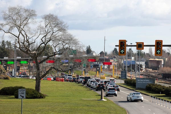 Vehicles prepare to enter the U.S. from Canada at the Peace Arch border crossing in Blaine, Washington, on March 5.JASON REDMOND/AFP/Getty Images
