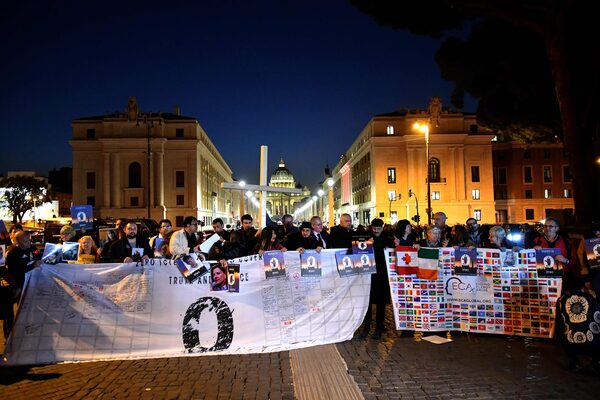 Members of Ending Clergy Abuse (ECA), a global organization of prominent survivors and activists hold a cross during a demonstration by the Castel Sant'Angelo in Rome on Thursday, Feb. 21, 2019.ALBERTO PIZZOLI/AFP/Getty Images