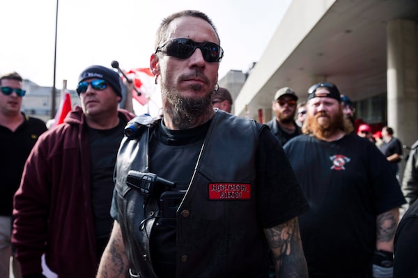 Far-right and ultra-nationalist groups, including the Northern Guard, Proud Boys, and individuals wearing Soldiers of Odin patches, were among those gathered to protest the government's lawsuit settlement with Canadian torture victim Omar Khadr, at Nathan Philips Square in Toronto on Oct. 21, 2017.Christopher Katsarov/The Canadian Press