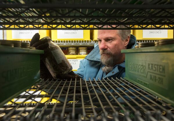 Donnie McPhee, Coordinator of the National Tree Seed Centre of Natural Resources Canada, holds a collection of Black Ash seeds in a deep-freeze vault that stores seeds of Canada’s tree species of conservational concern, in Fredericton, N.B., Monday, Aug. 26, 2019.Stephen MacGillivray/The Canadian Press