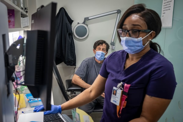 Jas Velic looks on as lab technician Sasha Gaye Phillips prepares to draw his blood before a weekly chemotherapy session. Hematologist Darrell White says nationwide negotiations, over provincial talks, should be the norm while advocating for Carvykti.EDUARDO LIMA/The Globe and Mail