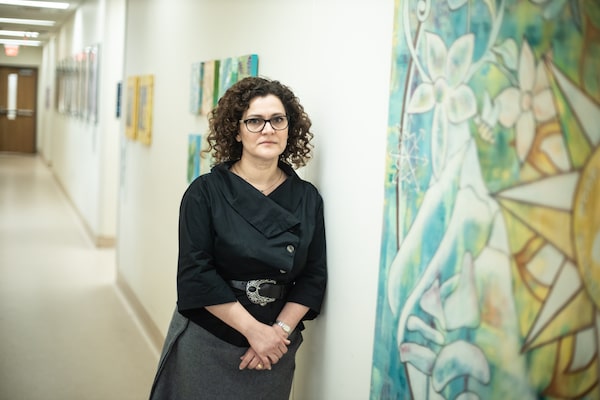 Dr. Zena Samaan at St. Joseph's Hospital in front of a wall of art created by patients, on Feb. 26, 2020. Dr. Samaan, a psychiatrist and suicide researcher at McMaster University, has been running a small pilot that makes regular calls to 50 people hospitalized for suicidal behaviour.The Globe and Mail