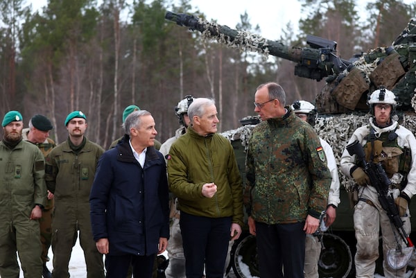 Carney, Norway's Stoere and Germany's Merz after a military exercise during the NATO Cold Response drills.Bernadett Szabo/Reuters