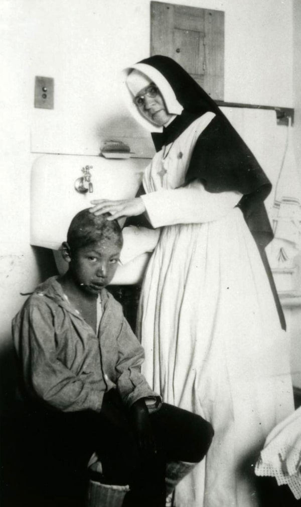 A Roman Catholic nun washes the hair of a male student at Guy Hill Residential School, 1926.Provincial Archives of Saskatchewan
