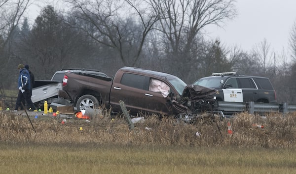Investigators examine a scene on County Road 17 in Kawartha Lakes, Ont., on Nov. 27, 2020.Fred Thornhill/The Canadian Press