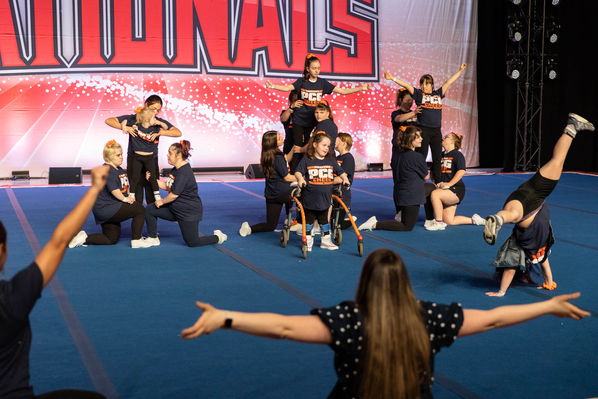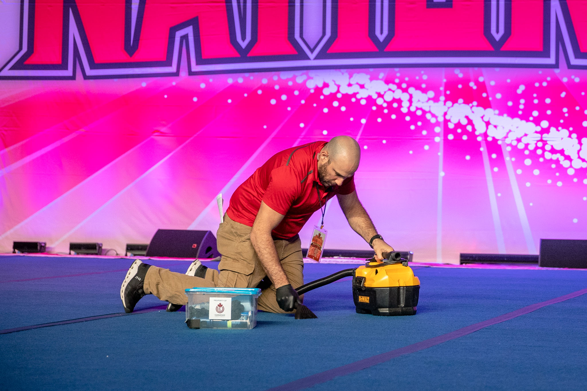 “I’m not just the vomit guy,” stressed Mario Carito, a former football and rugby player who got into cheer at 18, ultimately choosing it over rugby at college. He works about a dozen cheer competitions a year including Nationals, tending to the mats, running water stations, passing out the coveted Nationals competition blankets, setting up wheelchair ramps for the Cheerabilities athletes.
