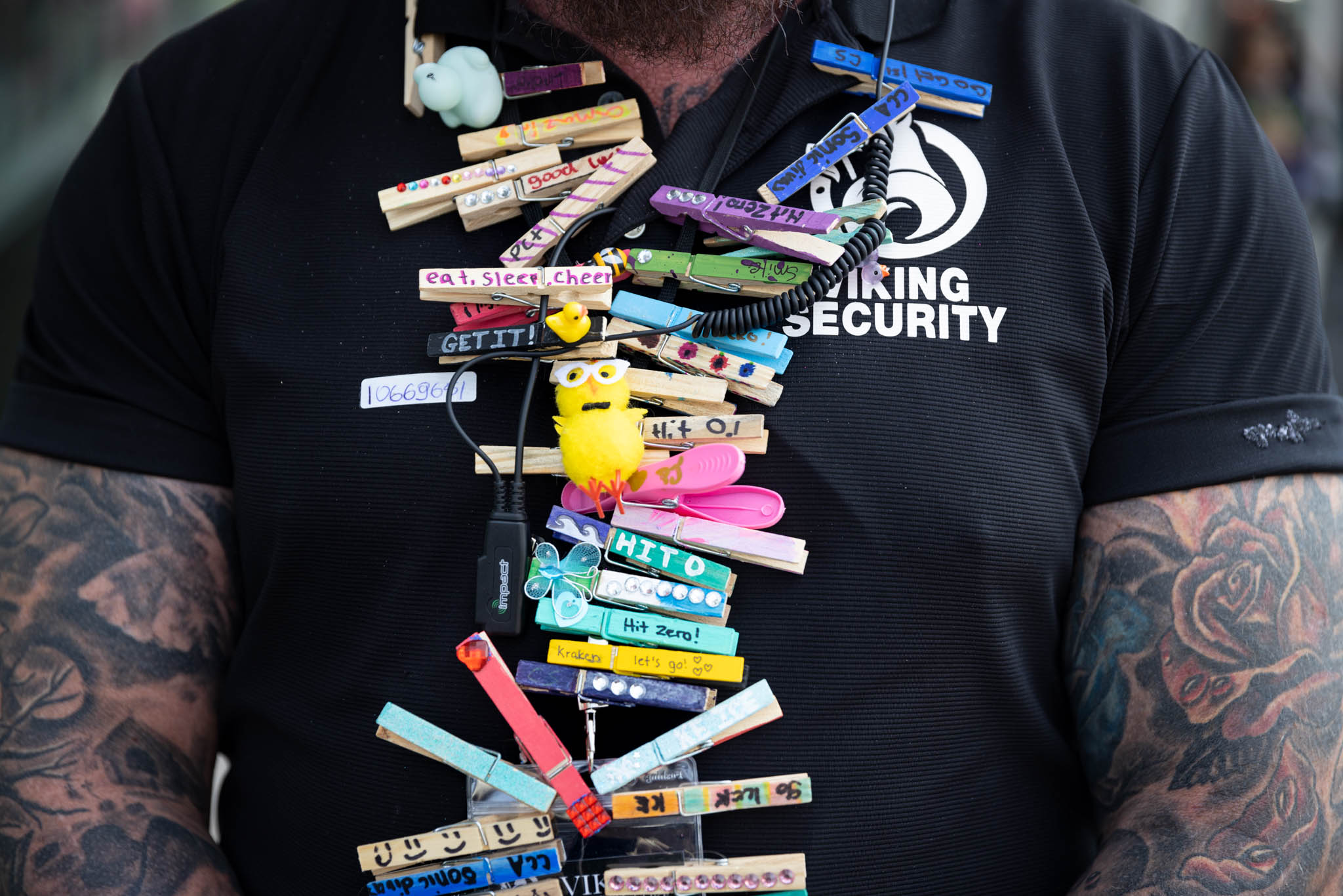 “It’s beautiful. Everything is so crazy,” said Ziggy G, a former nightclub bouncer working security at the cheer competition for the first time. In one tradition, cheerleaders decorate clothespins and slip them onto other athletes’ backpacks for luck. As the weekend went on, Ziggy G’s lanyard and ID tag were increasingly full of colourful pins with messages like, “Get it!” and “You rock!”