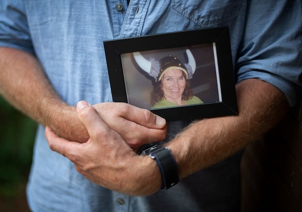 Tom Graham holds a framed photograph of his wife Cindy Lee Graham, on July 29. Cindy was diagnosed with Glioblastoma last year and passed away early this year.Fred Lum/The Globe and Mail