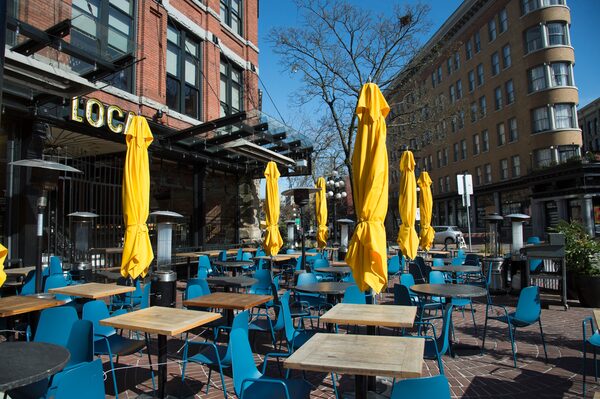 An empty patio is seen on St. Patrick's Day in Gastown in downtown Vancouver, March 17, 2020.JONATHAN HAYWARD/The Canadian Press