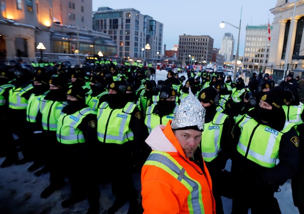 A person wears a tinfoil hat in front of a row of police as truckers and their supporters continue to protest against COVID-19 vaccine mandates in Ottawa on Feb. 18.PATRICK DOYLE/Reuters