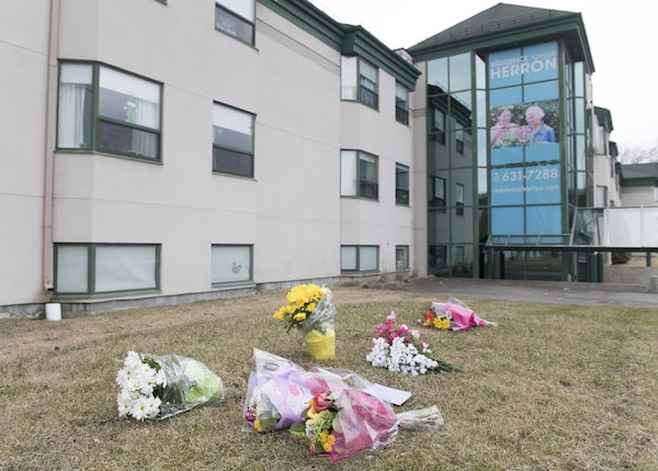 Flowers are shown outside Maison Herron, a long-term care home in the Montreal suburb of Dorval on April 12, 2020.Graham Hughes/The Canadian Press