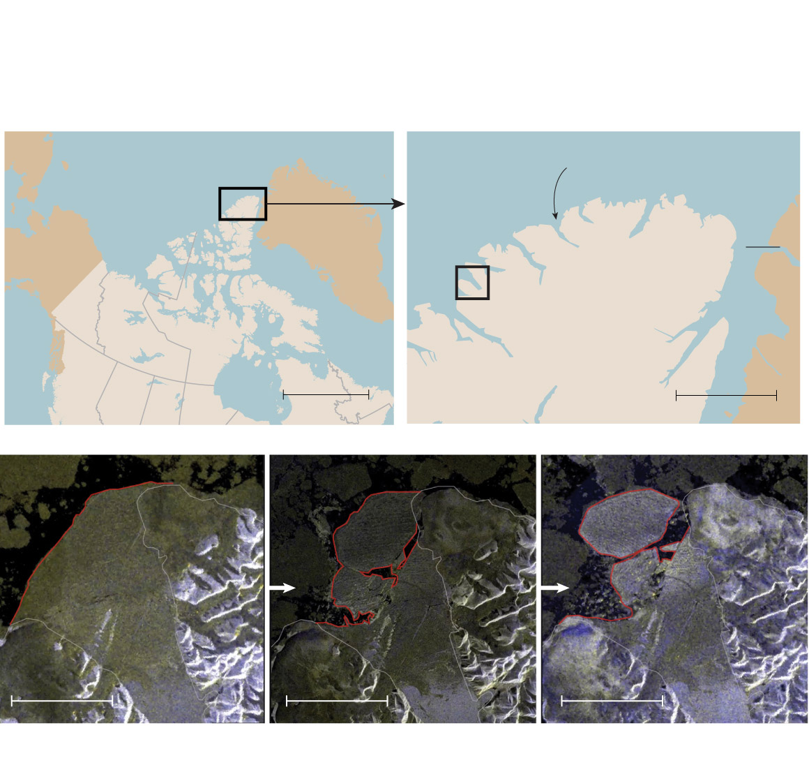 She said she first noticed something had changed on July 31, but clouds partly obscured what was happening to the ice shelf in the image that was available. The next day, the extent of the collapse became obvious. Details of the break-up have since been augmented by data from Canada’s Radarsat Constellation mission, a trio of satellites launched last year that can peer through clouds to obtain razor-sharp views of Arctic ice both night and day.
