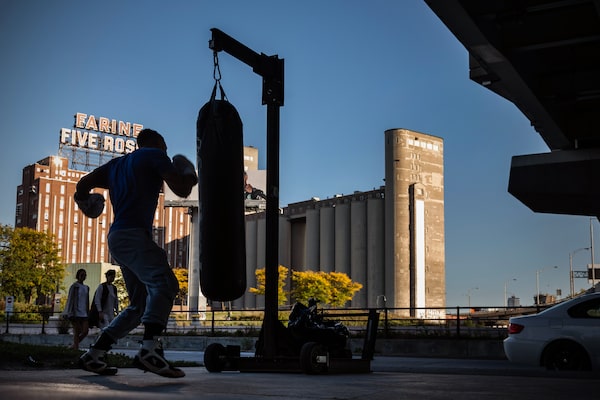 A young man trains in boxing. Behind him we see the iconic FARINE FIVE ROSES sign, a Montreal landmark notable for it's bilingual or "franglais" content.ROGER LEMOYNE/The Globe and Mail