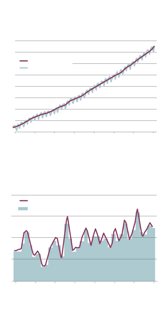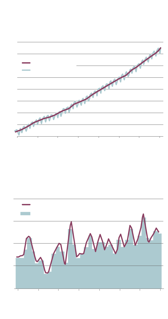 The long-term trend shows that the rate at which CO2 is being added to the atmosphere