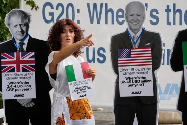An activist from the organization Avaaz stages a protest at Rome's Colosseum on Oct. 29 with cutouts of U.S. President Joe Biden and British Prime Minister Boris Johnson.Luca Bruno/The Associated Press