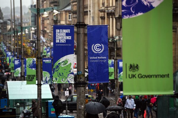 COP26 banners hang from lampposts in Glasgow on Oct. 29.ANDY BUCHANAN/AFP via Getty Images