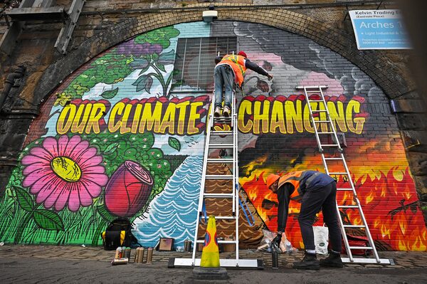 Artists paint a mural next to Glasgow's Clydeside Expressway, near the COP26 venue, on Oct. 26. Nearly 20,000 people are taking part in the conference over two weeks, including world leaders, academics and celebrity climate advocates.Jeff J Mitchell/Getty Images