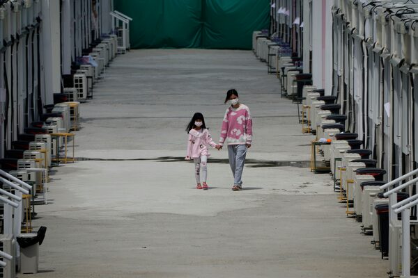 Patients walk along mobile cabins, serving as COVID-19 isolation facilities, in the San Tin area of Hong Kong, on March 11.Kin Cheung/The Associated Press