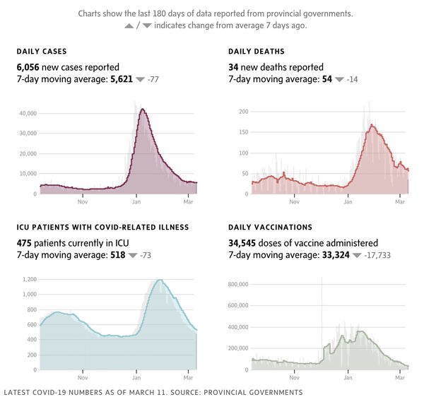 Sources: Canada data is compiled from government websites, Johns Hopkins and COVID-19 Canada Open Data Working Group; international data is from Johns Hopkins University.