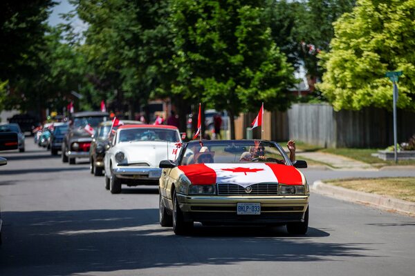 A drive-by parade makes its away around town during Canada Day celebrations in Newcastle, Ontario, Canada July 1, 2020.CARLOS OSORIO/Reuters