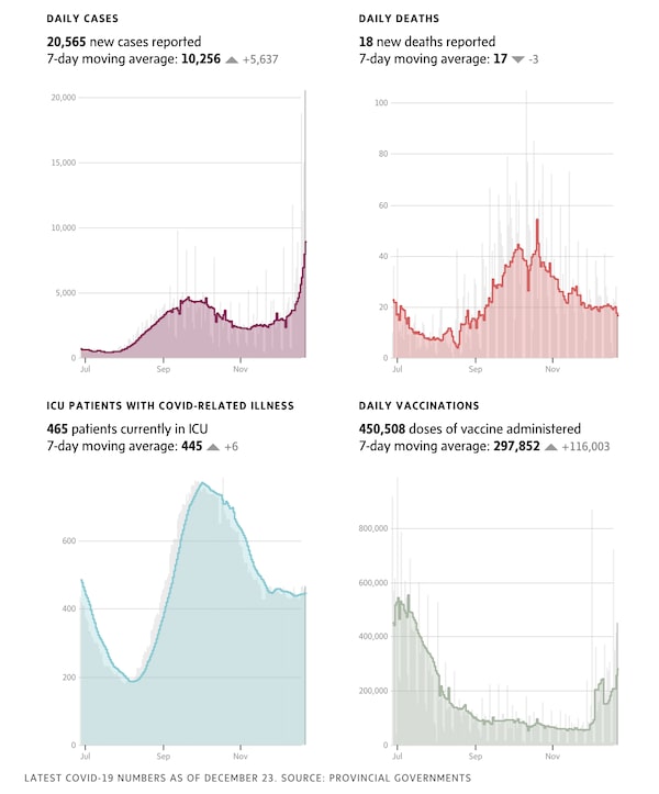 - The Quebec government reported 9,397 new cases Thursday – another record – and a rise of 28 COVID-related hospitalizations, for a total of 473. In Montreal, officials said one of every five Montrealers getting tested for COVID-19 was getting a positive result – and the latest data confirm that 90 per cent of infections in the city involve Omicron. Premier François Legault announced yesterday that private gatherings will be restricted to six people or two household bubbles in the province as of Dec. 26. The same rule will apply to tables in restaurants.