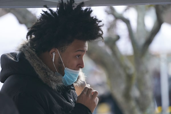 A man self administers a COVID-19 test at a mobile site in the Flushing Meadows section of Queens today in New York.BRYAN R. SMITH/AFP/Getty Images
