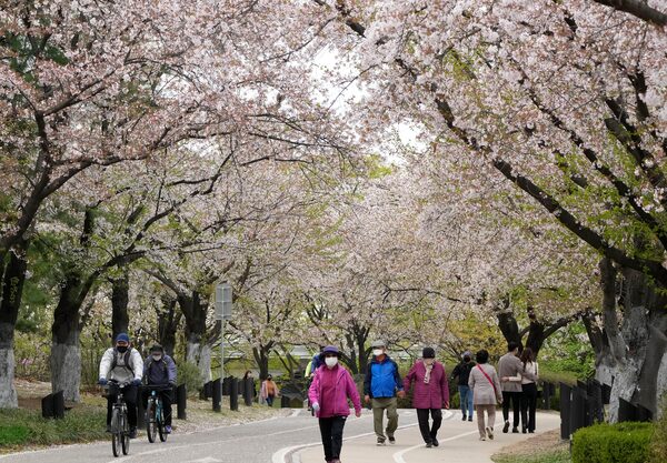 People wearing face masks stroll under cherry blossoms in full bloom at a park in Goyang, South Korea, on April 14.Ahn Young-joon/The Associated Press