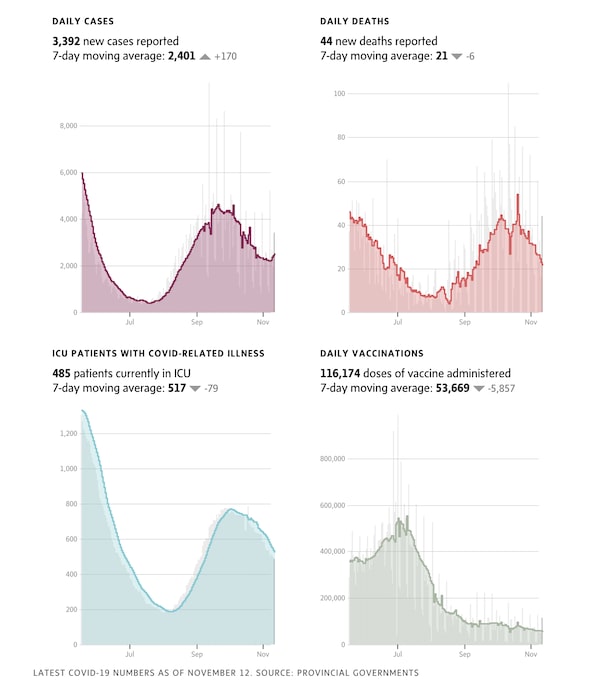 Sources: Canada data is compiled from government websites, Johns Hopkins and COVID-19 Canada Open Data Working Group; international data is from Johns Hopkins University.