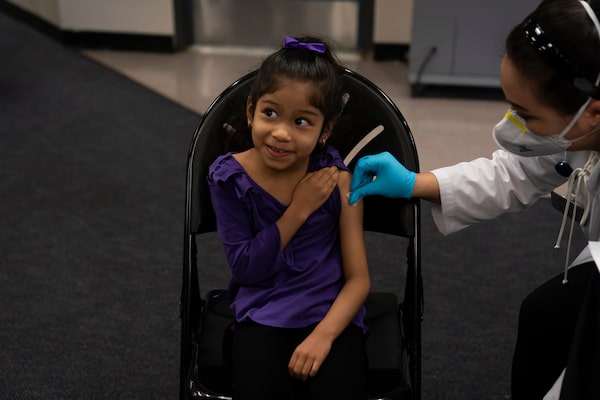 Elsa Estrada, 6, smiles at her mother as pharmacist Sylvia Uong applies an alcohol swab to her arm before administering the Pfizer COVID-19 vaccine at a pediatric vaccine clinic for children ages 5 to 11 set up at Willard Intermediate School in Santa Ana, Calif. Tuesday, Nov. 9, 2021.Jae C. Hong/The Associated Press