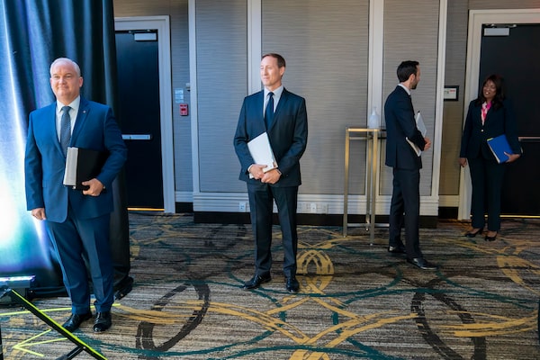 Conservative Party of Canada leadership candidates Erin O’Toole, left to right, Peter MacKay, Derek Sloan and Leslyn Lewis wait for the start of the French Leadership Debate in Toronto on Wednesday, June 17, 2020.Frank Gunn/The Canadian Press