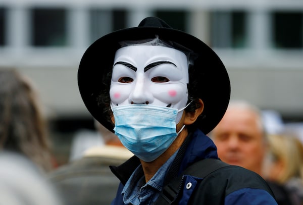A demonstrator wears a Guy Fawkes mask during a protest against the Swiss government's measures to slow down the spread of the coronavirus disease (COVID-19), at the Helvetiaplatz square in Zurich, Switzerland, August 29, 2020.ARND WIEGMANN/Reuters