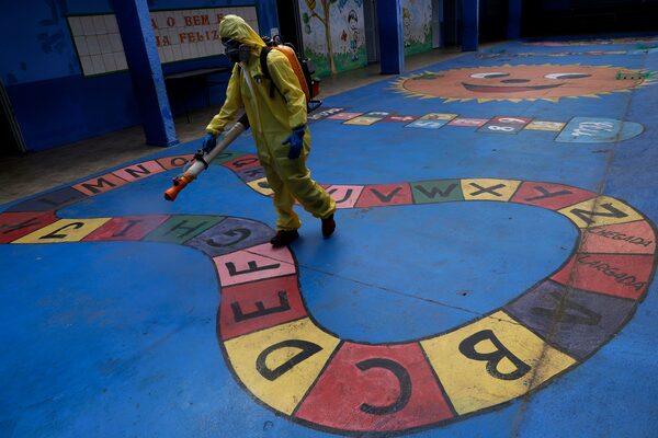 A government employee disinfects a public school in Brasilia on July 28. The local government in the Brazilian capital has began preparing for the safe reopening of schools in mid-August.Eraldo Peres/The Associated Press