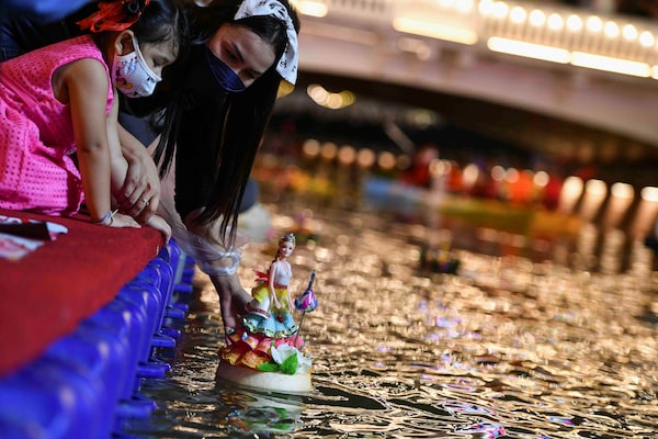 People wearing face masks to prevent the spread of the coronavirus disease gather to place krathongs (floating baskets) into a river during the Loy Krathong festival, which is held as a symbolic apology to the goddess of the river in Bangkok, Thailand, today.CHALINEE THIRASUPA/Reuters