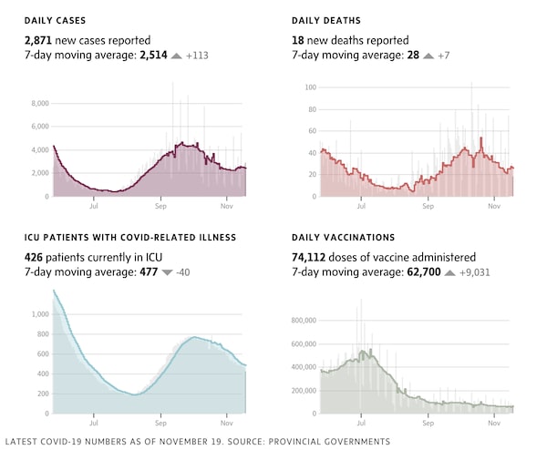 Sources: Canada data is compiled from government websites, Johns Hopkins and COVID-19 Canada Open Data Working Group; international data is from Johns Hopkins University.
