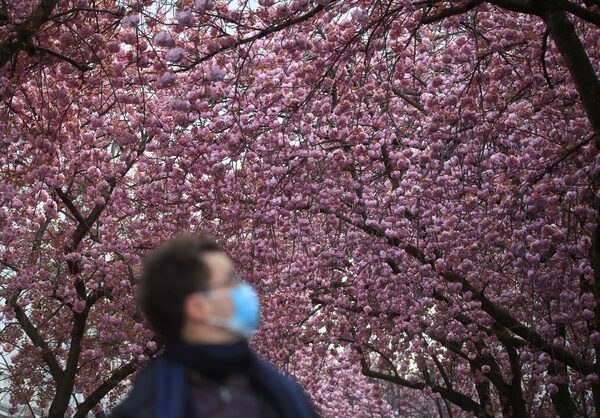 A man wears a face mask as he walks under cherry trees in full blossom in Heerstrasse (aka Cherry Blossom Avenue) in Bonn, Germany, on April 15, 2021WOLFGANG RATTAY/Reuters