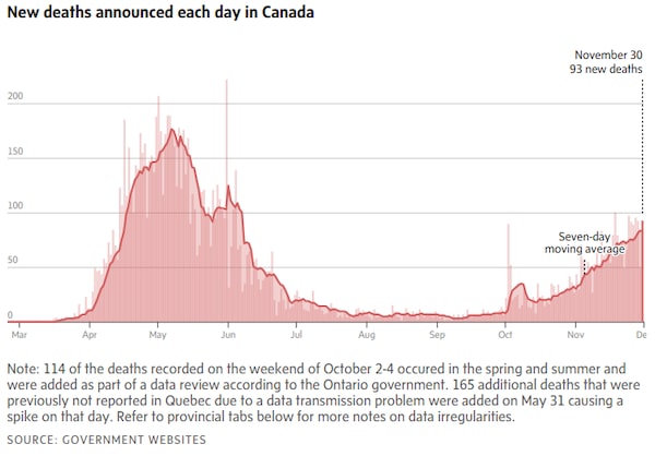 Sources: Canada data is compiled from government websites, Johns Hopkins and COVID-19 Canada Open Data Working Group; international data is from Johns Hopkins University.