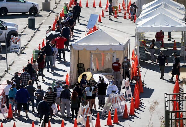 People wait in line for COVID-19 testing on the Monday after Thanksgiving weekend in Los Angeles. Health officials in Los Angeles County have issued a new limited stay-at-home order in effect for the next three weeks amid a surge in coronavirus cases.Mario Tama/Getty Images