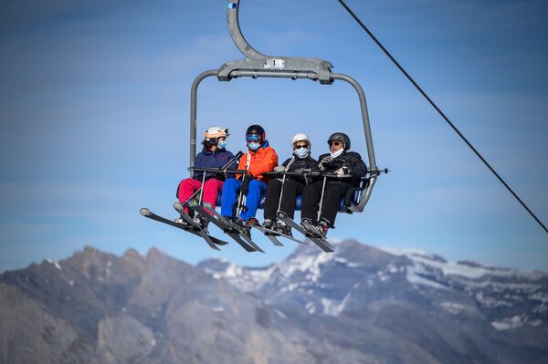 Skiers wearing face masks to protect against the spread of COVID-19 ride a ski lift before hitting the slopes in the Swiss resort of Verbier this month. As European Union countries debate a bloc-wide ban on ski holidays to curb coronavirus infections, downhill enthusiasts may be tempted to head to non-member Switzerland, where the winter season is well under way.FABRICE COFFRINI/AFP/Getty Images