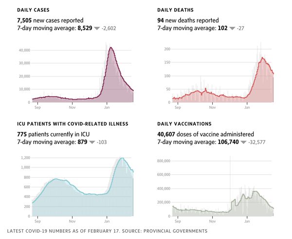 - Capacity limits are lifting in Ontario restaurants, gyms and cinemas where patrons must be screened for vaccines, and sports arenas and theatres can be filled up to half capacity. There are 1,342 people with COVID-19 in hospital in the province, and 356 in ICU, down from 1,403 and 364 last week. Thirty-six deaths are being reported due to the coronavirus. In Windsor, the mayor received a bomb threat over COVID-19 measures. Across the province, many hospitals will be keeping mandatory COVID-19 vaccination for staff and some visitors.