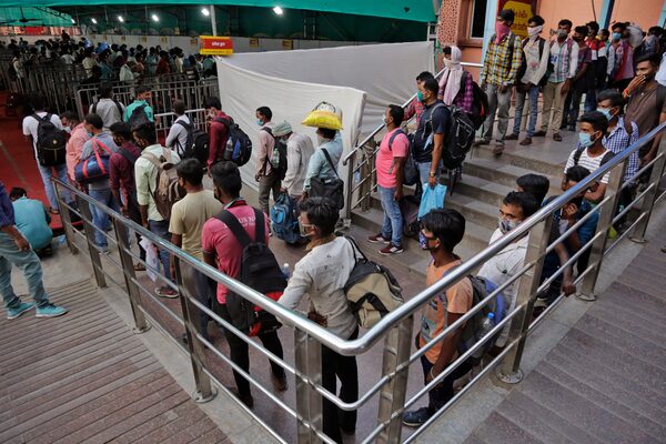 Indian passengers queue up for COVID-19 tests at a facility erected at a railway station to screen people coming from outside the city, in Ahmedabad, India, on Monday. India's coronavirus cases are now the second-highest in the world and only behind the United States.Ajit Solanki/The Associated Press