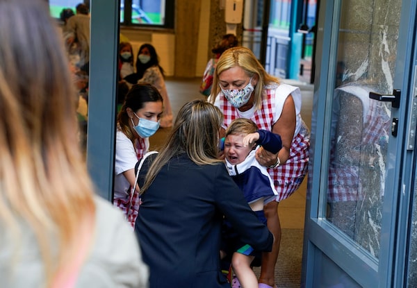 A teacher wearing a mask to protect against COVID-19 welcomes a pupil on the first day of school after summer holidays at Colegio Pureza de Maria school in Bilbao, Spain, on Monday.VINCENT WEST/Reuters