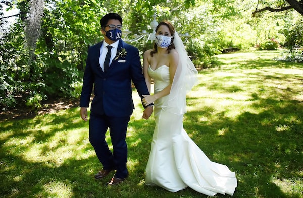 Newly married couple Rachel and Sebastian Vasquez from Lynchburg, Virginia, wear their masks during their wedding ceremony on May 9, 2020 at the Glencliff Manor in Rustburg, Virginia. - The Glencliff Manor officiates free, socially distanced ceremonies for couples left with no wedding plans during the coronavirus pandemic. Only ten people are allowed at each hour-long ceremony.OLIVIER DOULIERY/AFP/Getty Images
