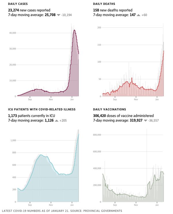 Sources: Canada data is compiled from government websites, Johns Hopkins and COVID-19 Canada Open Data Working Group; international data is from Johns Hopkins University.