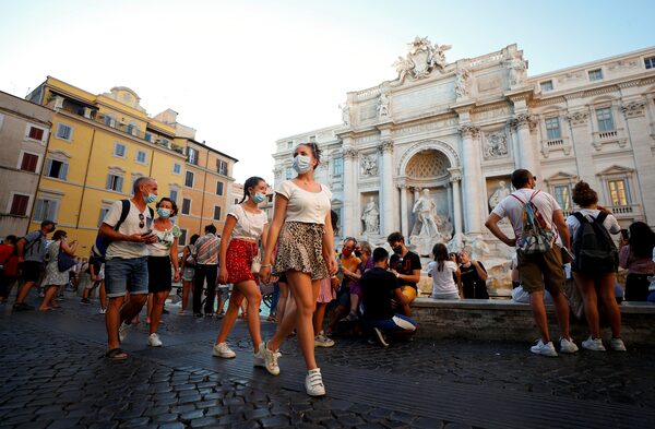 People wearing face masks walk in front of the Trevi Fountain following a government decree that states face coverings must be worn between 6 p.m. and 6 a.m. near bars and pubs and in areas where gatherings are more likely, due to the coronavirus disease (COVID-19) outbreak, in Rome, Italy August 19, 2020.Guglielmo Mangiapane/Reuters