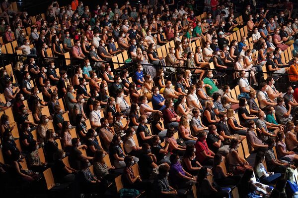 Participants wearing FFP2 protective face masks watch singer Tim Bendzko perform in the RESTART-19 Covid transmission risk assessment study in a concert setting at an indoor arena during the coronavirus pandemic on August 22, 2020 in Leipzig, Germany.Sean Gallup/Getty Images